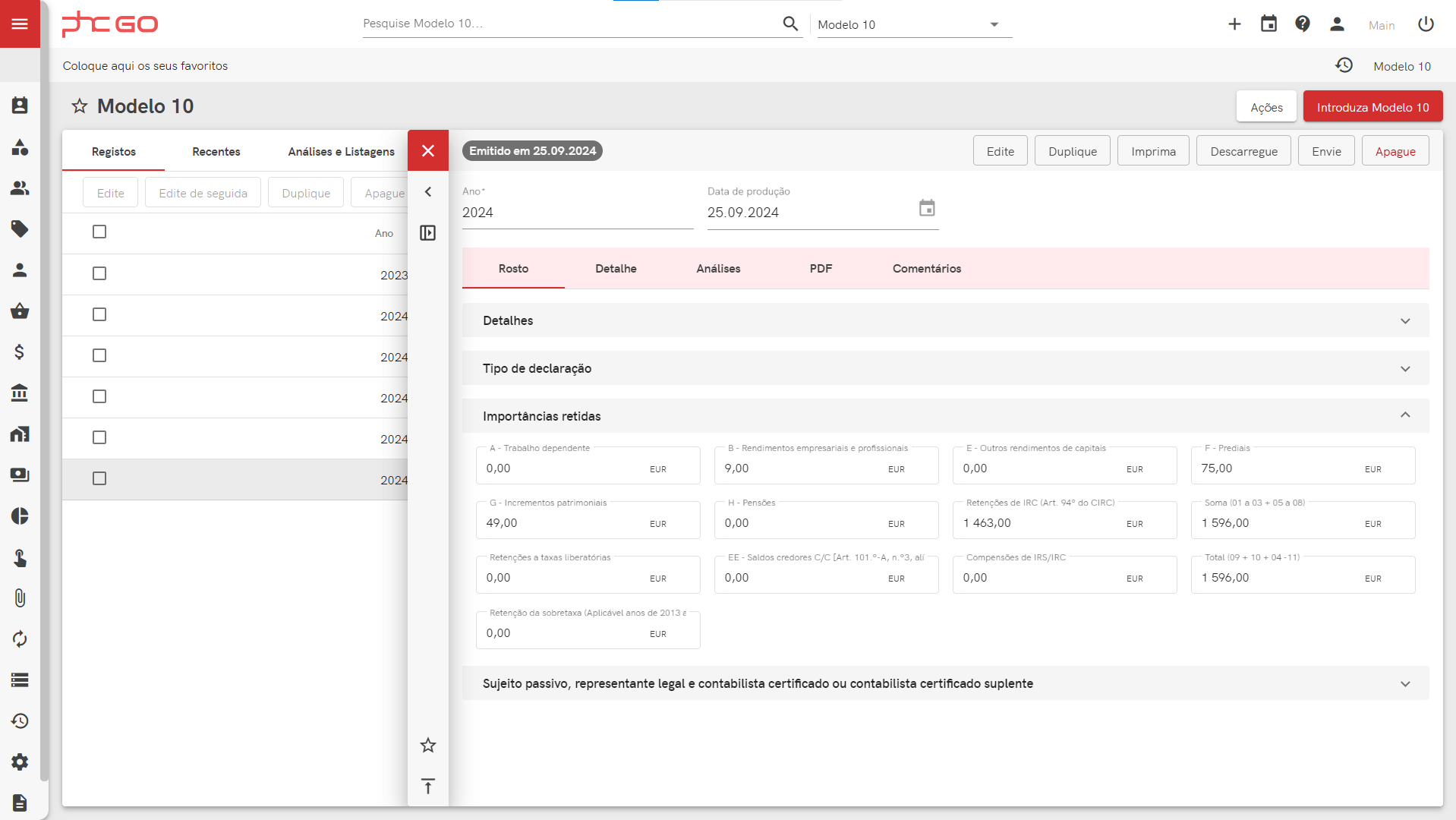 - Preenchimento automático da Modelo 10 com base nos dados já registados na contabilidade do software, para reduzir o tempo despendido e o risco de erros de cálculo manuais ou omissões.